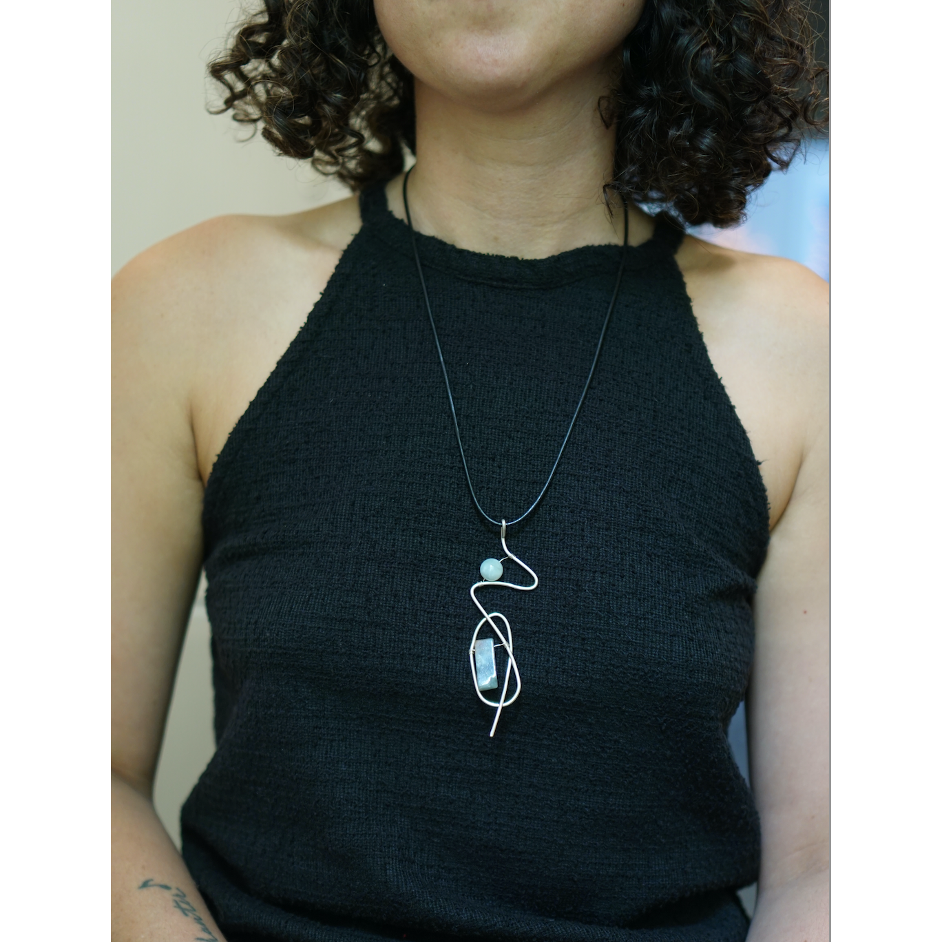 Clarity of the Heart is made with a highly tarnish-resistant Argentium Silver one-of-a-kind Breath Piece pendant holding two aquamarine stones on an adjustable leather necklace cord.